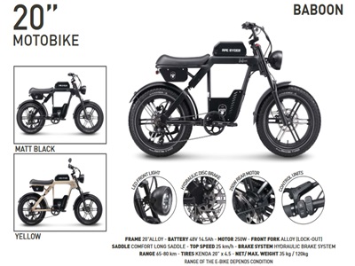 / CONFORTABLE SADDLE / TOP SPEED 25 km per hour / HYDRAULIC BRAKE SYSTEM / RANGE 65-80 km / TIRES KENDA 20” x 4.5 / NET – MAX. WEIGHT 35 kg – 120kg / LCD DISPLAY / CHARGING DURATION BETWEEN 5 – 7 HOURS