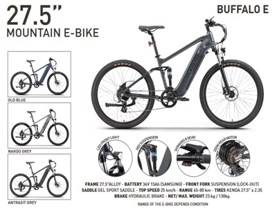 FRAME 27.5”ALLOY / LITHIUM-ION BATTERY 36V 15Ah (SAMSUNG) / BAFANG MID MOTOR 250W / SHIMANO 8 GEAR / FRONT FORK SUSPENSION (LOCK-OUT) / GEL SPORT SADDLE / TOP SPEED 25 km per hour / HYDRAULIC BRAKE SYSTEM / RANGE 65-80 km / TIRES KENDA 27.5” x 2.35 / NET – MAX. WEIGHT 23kg – 130kg / LCD DISPLAY / CHARGING DURATION BETWEEN 5 – 7 HOURS / LED FRONT LIGHT